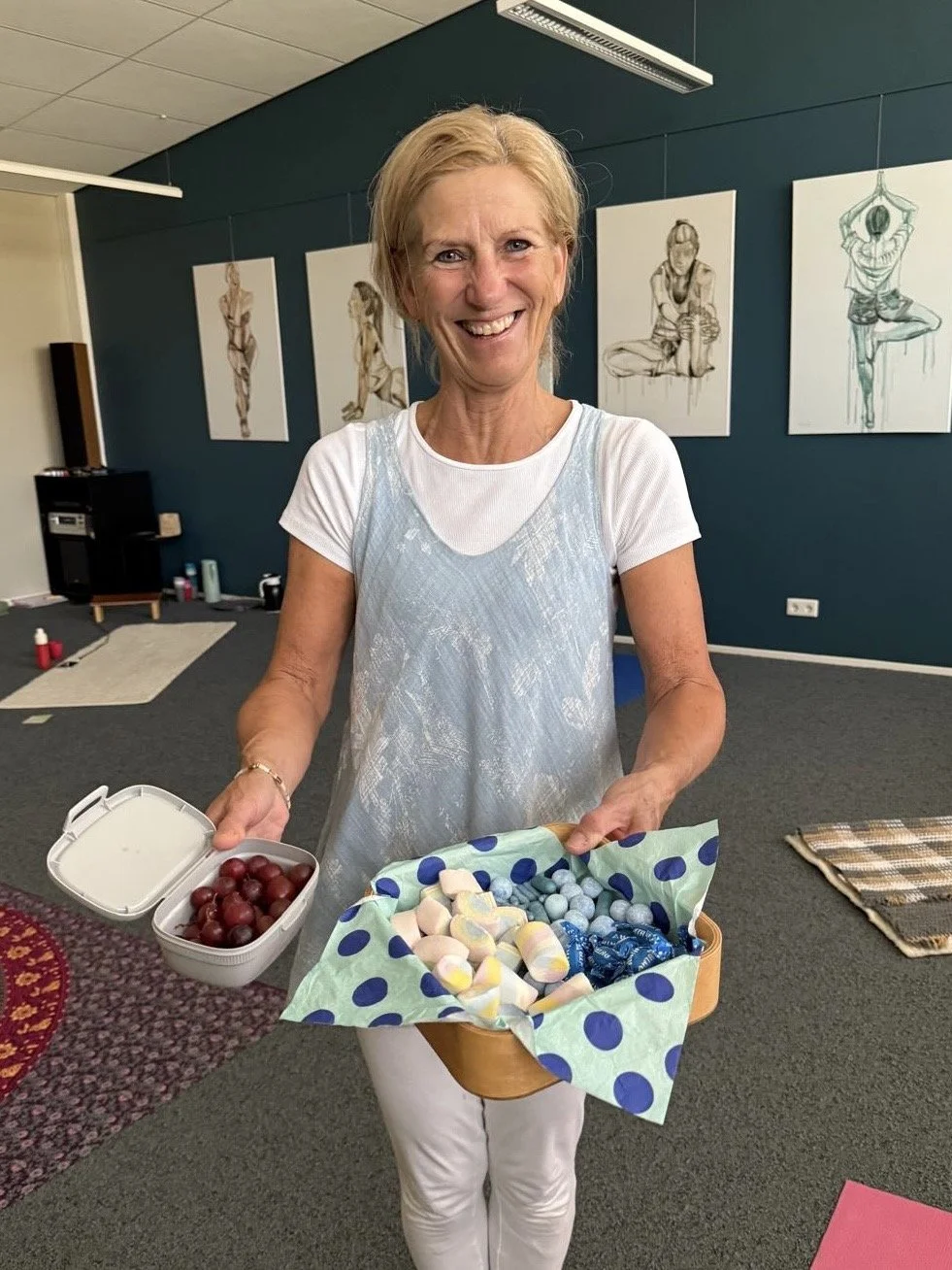 Wat een rijkdom om hier van mee te mogen genieten als opa en oma. Binnen een half jaar hebben wij een kleindochter en een kleinzoon, wat een feest. En dat hebben we gevierd in alle yogagroepen. Een hele speciale week vond ik het. Alles in het thema blauw met m’n blauwe jurkje aan, blauwe bloemen, blauwe traktaties bij de thee.